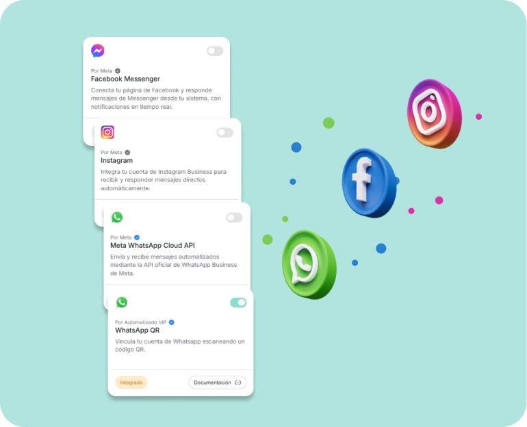 Atiende desde un solo lugar con AutomatizadoVIP, API Oficial de Meta, WhatsApp QR, Menseger, Instagram.