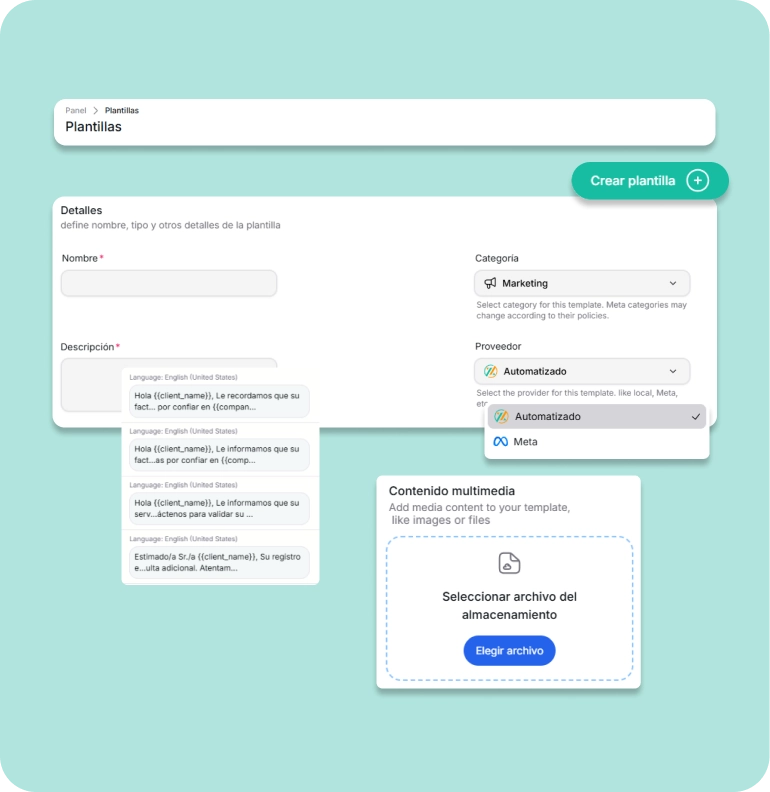 Crea plantillas con mensajes predefinidos y campos personalizados para enviar a tus clientes.